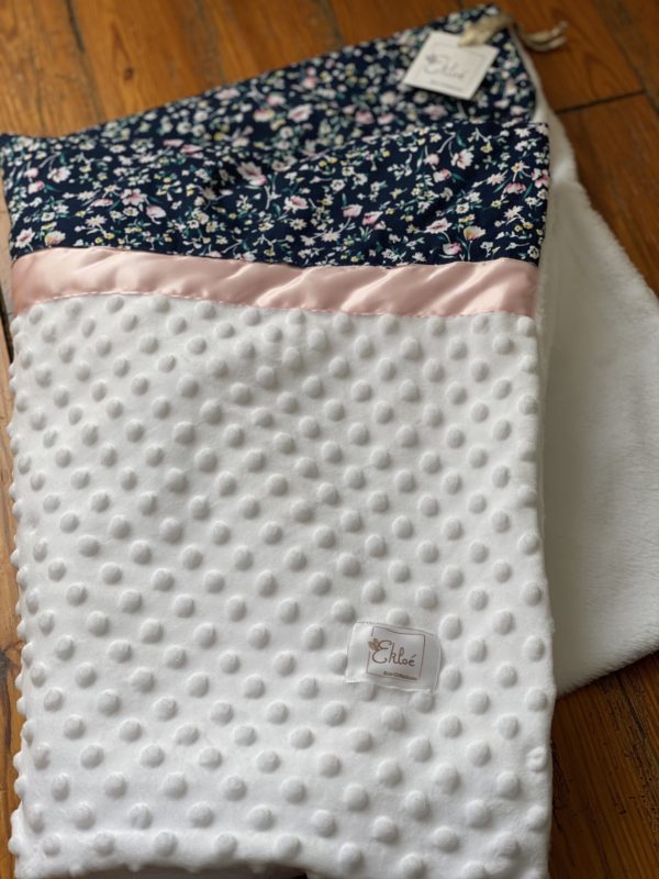 Couverture pour bébé 70x100cm faite main, éco-responsable, car composée exclusivement de tissus BIO. Devant minkee velours relief à pois, dos en fourrure extra douce.
