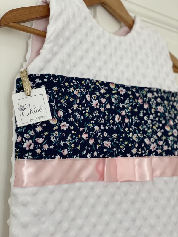Gigoteuse minky hiver esprit Liberty fleuri rose et marine pour bébé naissance, douillette et moelleuse, elle est aussi éco-responsable, car composée à 30% de coton issu du surcyclage.